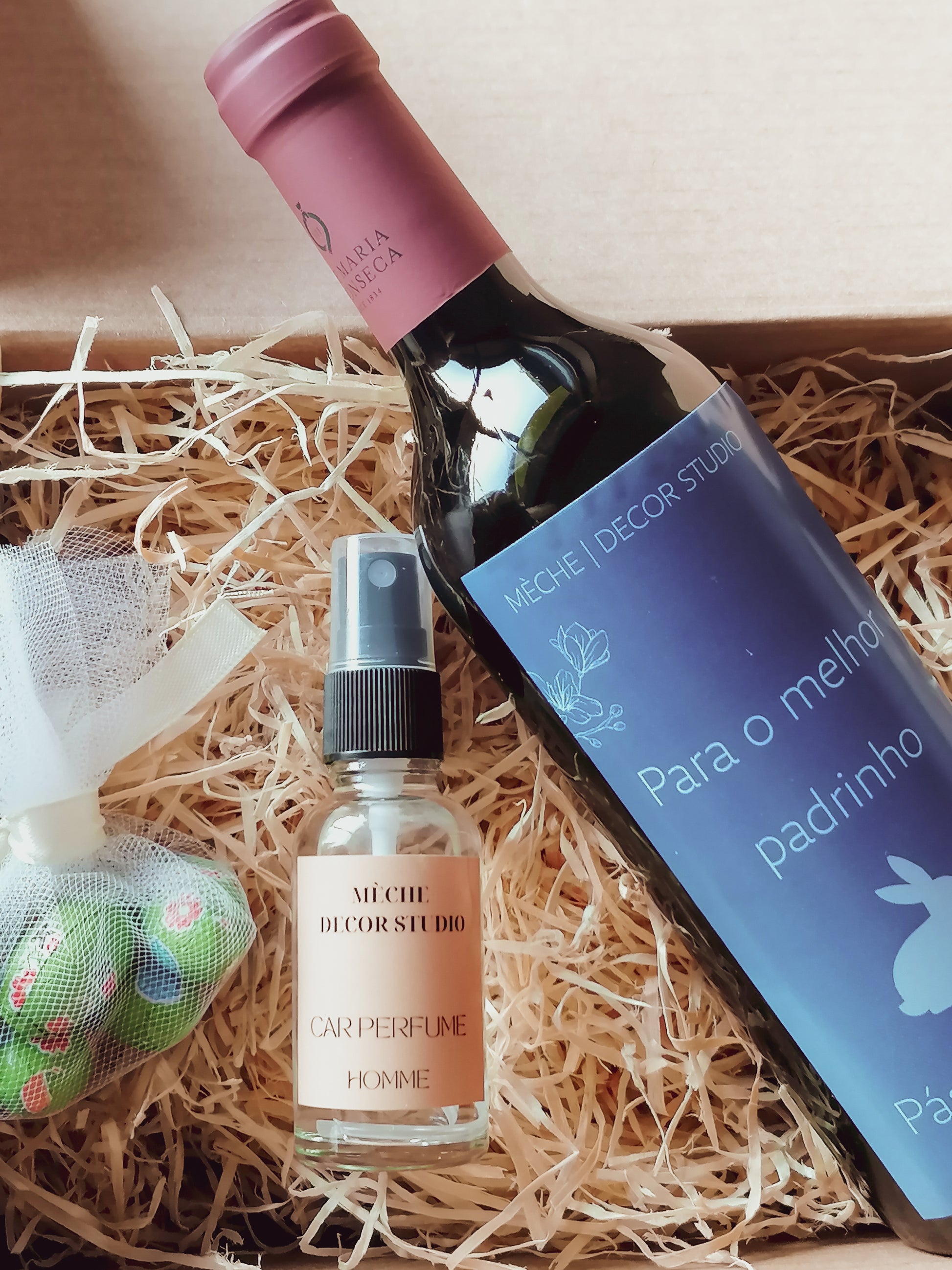 Para o padrinho que está sempre em movimento, mas que não abdica de um momento de pausa. Este pack combina a tradição do vinho e do chocolate com a modernidade de um perfume para o carro de fabrico artesanal.